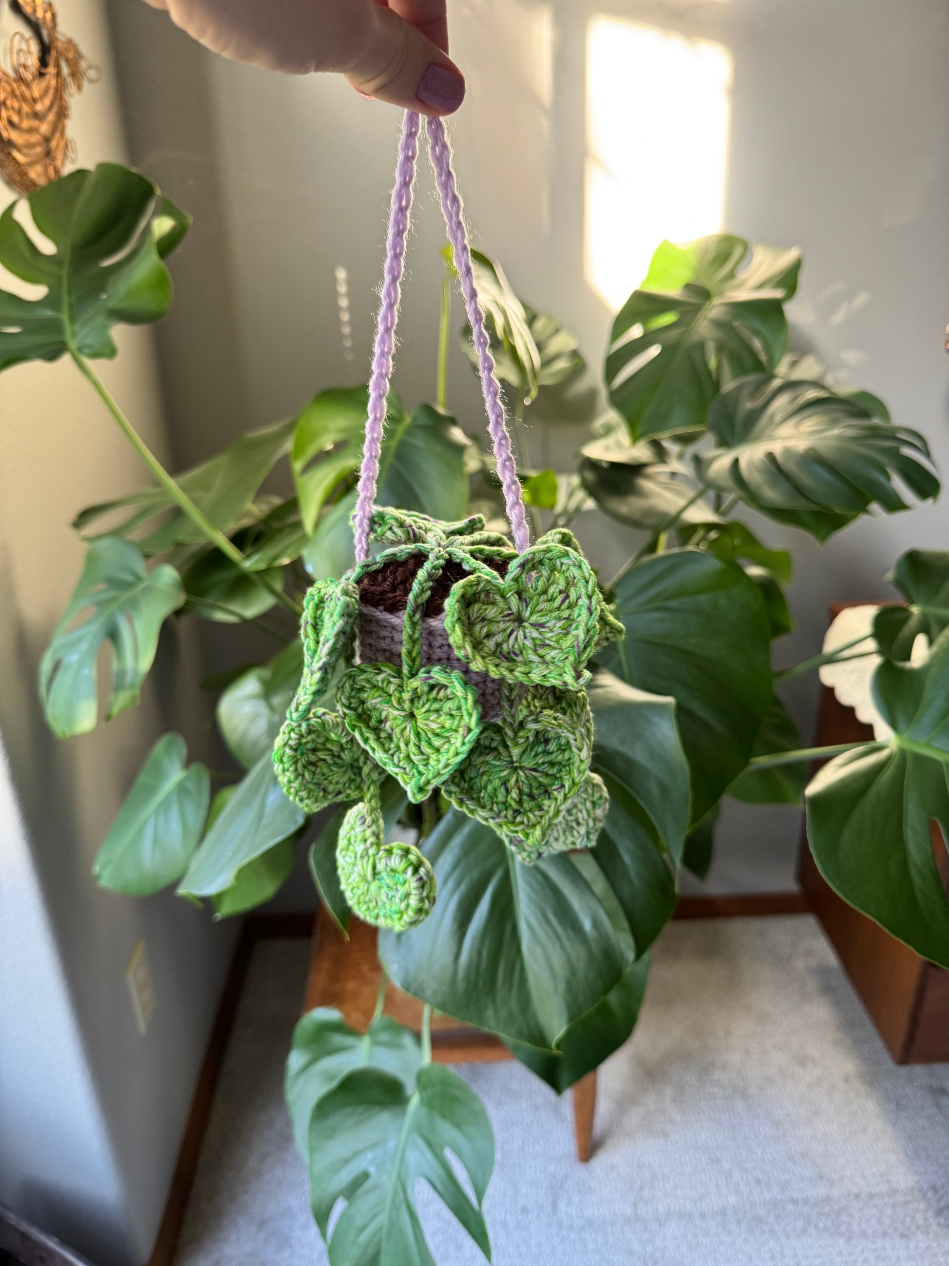 A handmade string of hearts plant to add to your home, car, office, or dorm! Featuring shades of green and purple, this is a unique (and everlasting) plant to decorate your space.